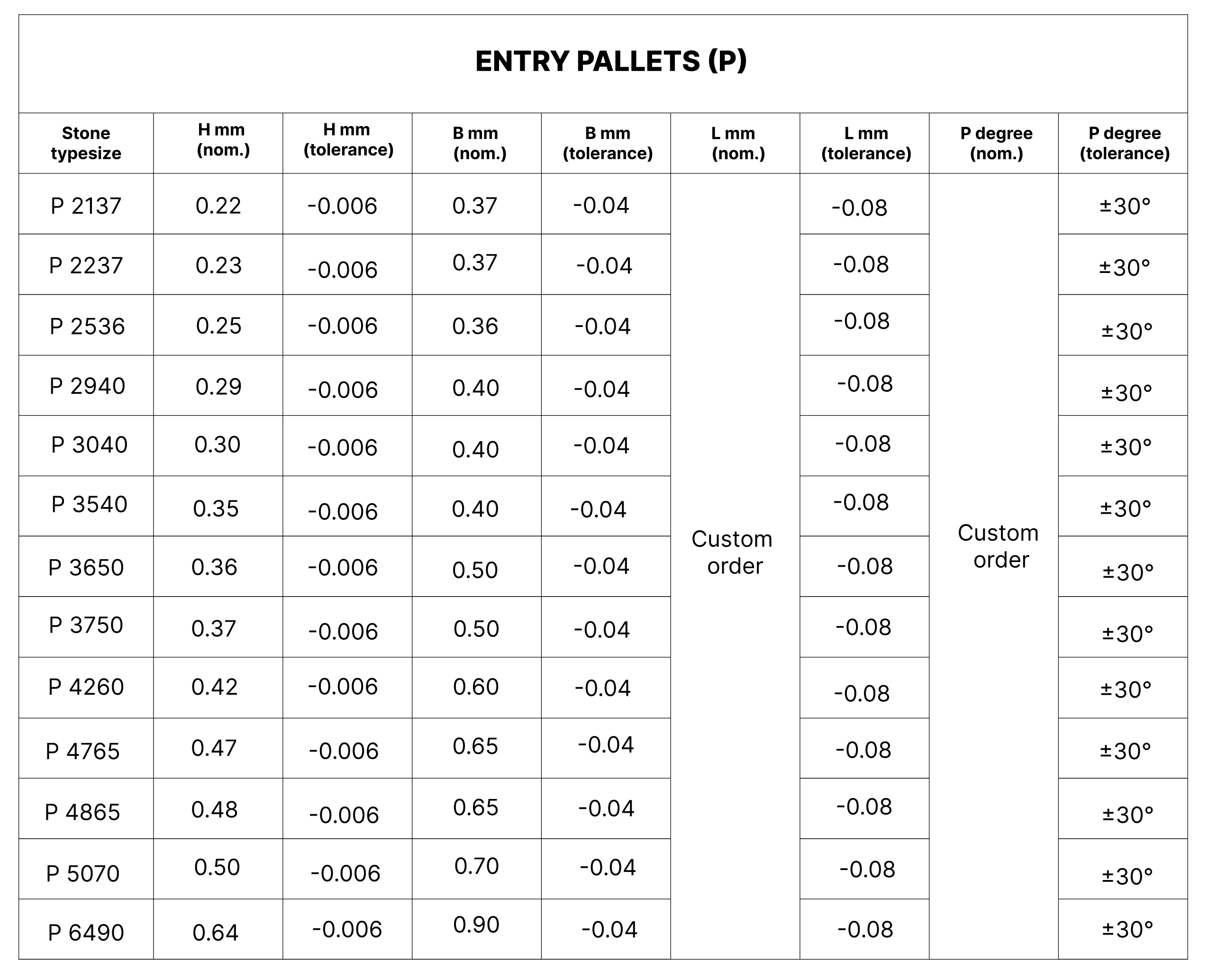 resting planes with the end face, with chamfer radii of 0.005–0.15 mm.