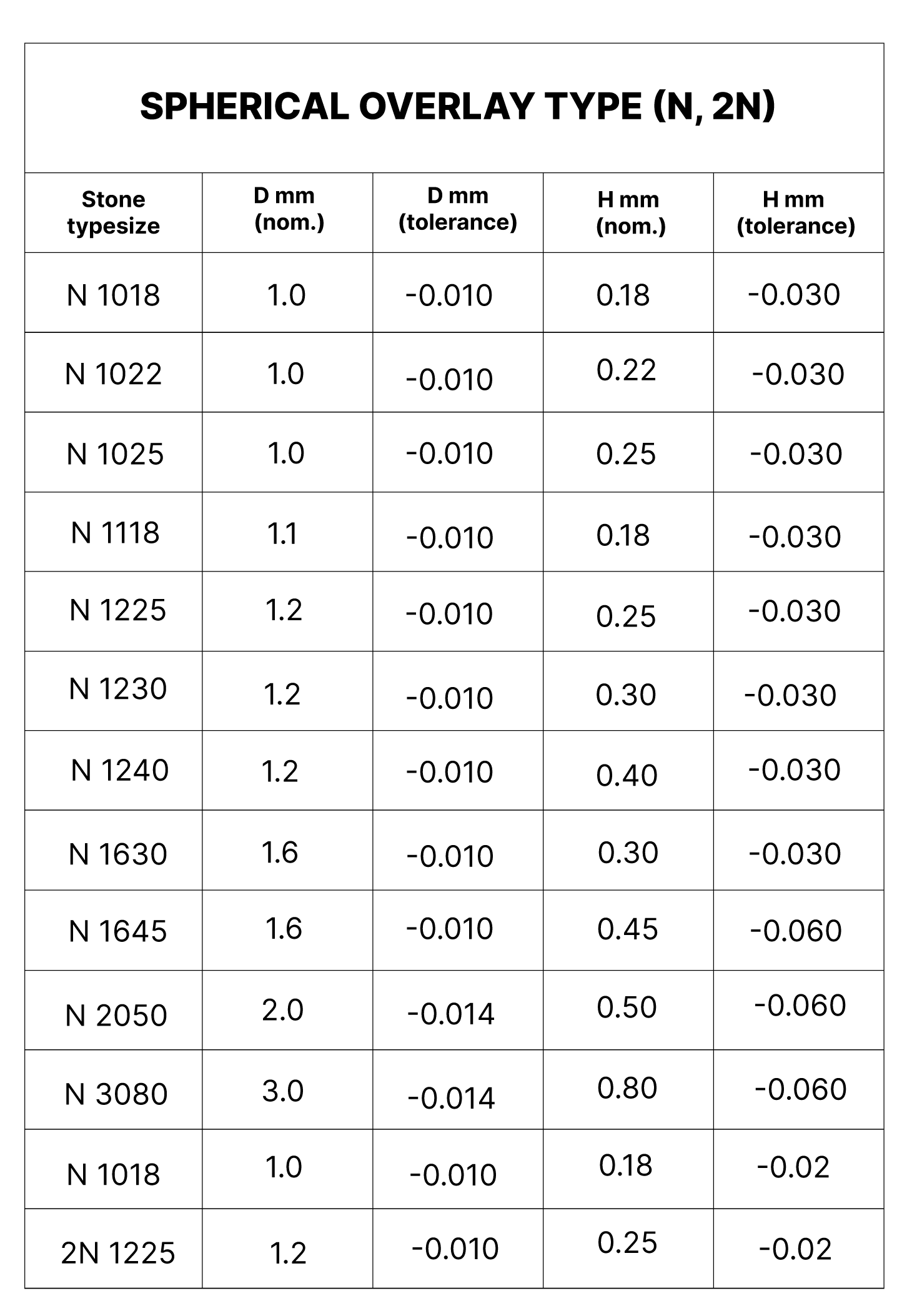 Upon customer request, 2N overlay stones with a height tolerance of N down